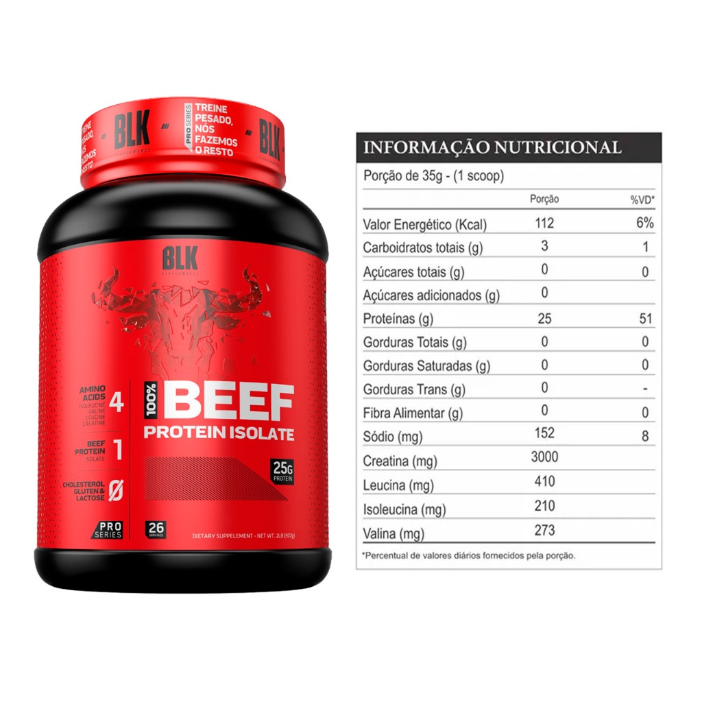 COMPOSIÇÃO DO ANÚNCIO 1x BEEF PROTEIN ISOLATE - 900G - BLK PERFORMANCE DESCRIÇÃO DO PRODUTO "Com uma concentração inigualável, o 100% Beef Protein Isolate chegou para fazer você ganhar mais volume e massa muscular. Nosso produto lhe oferece 25g de proteína isolada e hidrolisada da carne, além de uma concentração de aminoácidos maior do que um bife e do que o Whey Protein isolado. 100% Beef Protein Isolate é para quem buscar aumentar mais sua massa muscular, força, volume e recuperação. Sem glúten, lactose e colesterol, nossa proteína pode ser utilizada por qualquer pessoa, pois é um produto limpo e totalmente eficaz. PARA QUEM É O BEEF PROTEIN: Para quem tem intolerância a glúten e lactose. Para praticantes de atividades físicas. Para quem busca aumento de massa muscular. Para quem não pode usar whey protein. Para quem busca aumento de força. COMO UTILIZAR: Para quem busca o aumento de massa muscular, pode utilizar 1 medidor antes e/ou após os treinos. Para quem busca aumentar o aporte de proteínas do dia, 1 medidor junto com um lanche, ou antes, de dormir. Para idosos que querem prevenir a sarcopenia, usar 1 medidor batido com frutas ou junto com alguma bebida de sua preferência. Para Objetivos mais específicos, importante orientação de seu nutricionista. MODO DE PREPARO: Diluir em mixer, coqueteleira ou liquidificador 1 medidor (35g) em 200 ml de água. MODO DE CONSERVAÇÃO: Conservar esse produto bem fechado em lugar fresco, seco e ao abrigo da luz. Após aberto consumir em até 60 dias. PARA QUE SERVE Aumento de força; Melhora a desempenho físico; Aumento de massa muscular. INGREDIENTES: Proteína da carne bovina isolada e hidrolisada, maltodextrina, peptídeo de colágeno hidrolisado, cacau em pó alcalino lecitinado, cretina monohidratada micronizada, colágeno hidrolisado, I-leucina, I-valina, I-isoleucina, sal marinho, aroma idêntico ao natural e natural de chocolate, espessante, goma xantana, antiumectante, dióxido de silício e edulcorantes: acessulfame de potássio e sucralose. ALÉRGICOS: PODE CONTER DERIVADOS. NÃO CONTÉM GLÚTEN. NÃO CONTÉM LACTOSE. NÃO CONTÉM COLESTEROL. ESTE PRODUTO NÃO SUBSTITUI UMA ALIMENTAÇÃO EQUILIBRADA E SEU CONSUMO DEVE SER ORIENTADO POR NUTRICIONISTA OU MÉDICO. PRODUTO DISPENSADO DE REGISTRO CONFORME A RDC 240/2018."