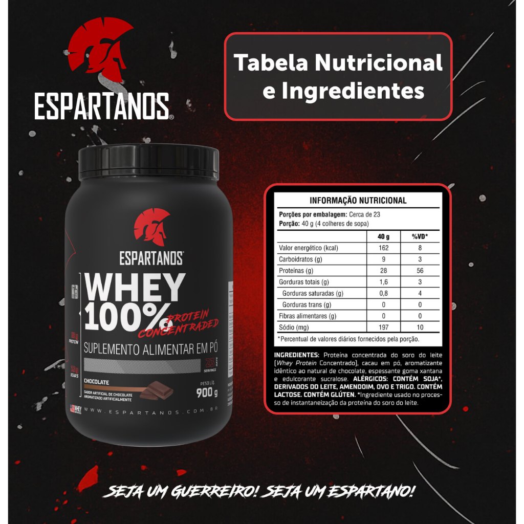 Whey Protein Espartanos contém alto grau de pureza formulado exclusivamente com WPC 80. Whey Protein Concentrado 100% Pure, contém alto teor de proteínas, bcaa's, glutamina e baixíssimo teor de carboidratos e gorduras. Trabalhamos exclusivamente com Whey Protein Importado, utilizamos WPC 80 das marcas Lactalis, Arla Foods e Agropur. Qualidade mundialmente aprovada. Whey Concentrado Espartanos fornece 32g de Proteínas por dose, das quais 7,2g são aminoácidos de cadeia ramificada BCAA's e 6g são Glutamina e Percursores. Sabor incomparável, utilizamos aromas desenvolvidos por especialistas renomados exclusivamente para a Espartanos. Sabores intensos e marcantes, experimente agora mesmo o sabor baunilha, perceberá que até "baunilha" pode surpreender!