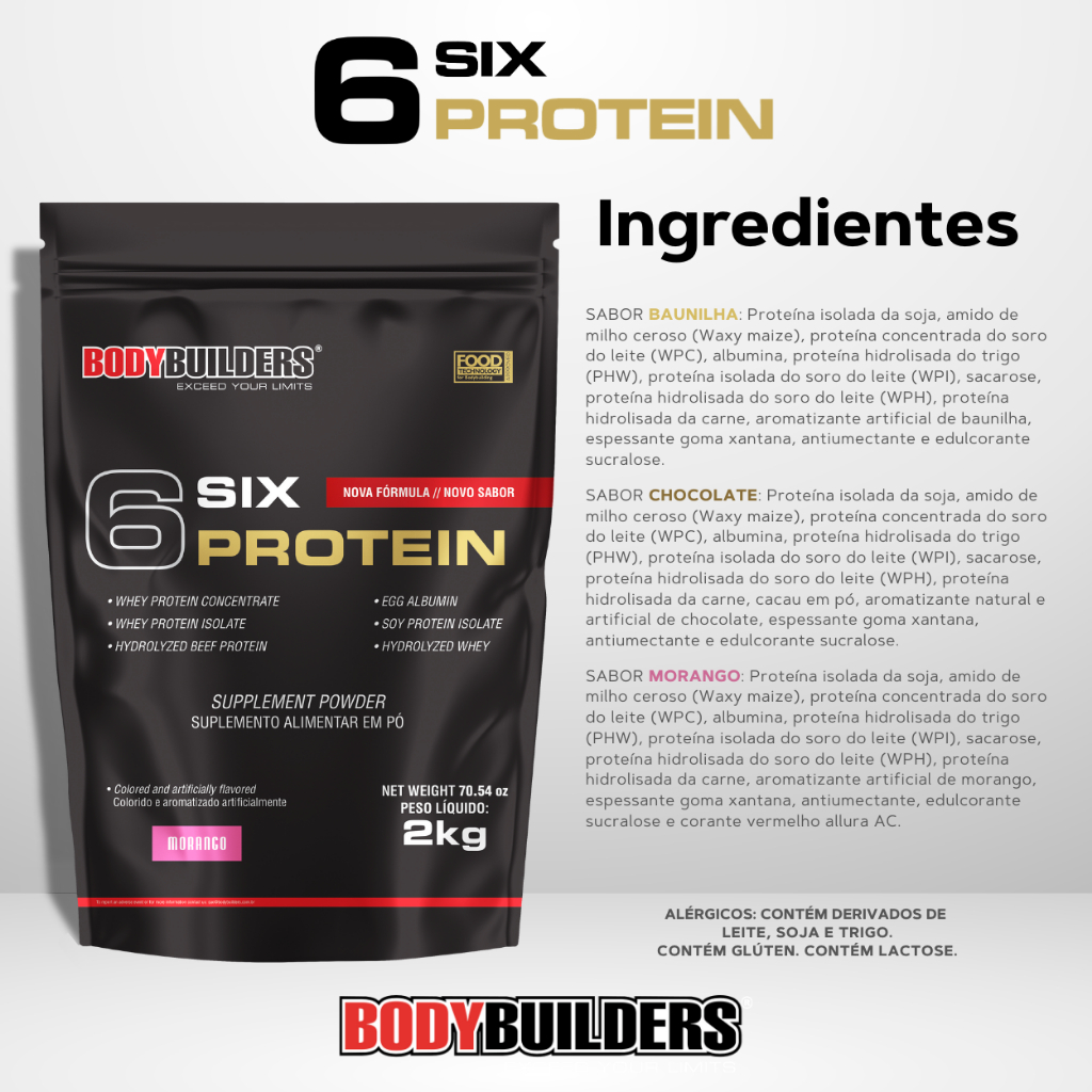 6 SIX PROTEIN – Bodybuilders O 6 SIX PROTEIN da Bodybuilders é um suplemento alimentar em pó formulado com um blend exclusivo de 6 fontes proteicas, incluindo whey protein concentrado, isolado e hidrolisado, albumina, proteína isolada da soja e proteína hidrolisada da carne. Desenvolvido para oferecer alto teor de proteínas e aminoácidos essenciais, é ideal para quem busca suporte nutricional no ganho de massa muscular e na recuperação pós-treino. Cada porção fornece 21g de proteína, contribuindo para o crescimento e a manutenção da massa muscular, além de auxiliar na reposição proteica diária em dietas com maior exigência. Modo de uso: Adicionar 40g (4 colheres de sopa) em 300mL de água. Bater no liquidificador ou coqueteleira por 20 segundos e consumir imediatamente após o preparo. Recomendado o consumo de 2 a 3 porções ao dia, ou conforme orientação de profissional de saúde. Avisos: Este produto não é um medicamento. Não exceder a recomendação diária de consumo indicada na embalagem. Gestantes, lactantes, crianças e pessoas com enfermidades devem consultar um profissional de saúde antes do consumo. Manter fora do alcance de crianças. Alergênicos: Contém derivados de leite, soja e trigo. Contém glúten. Contém lactose.