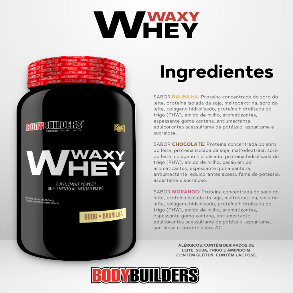 Waxy Whey – Bodybuilders Suplementos O Waxy Whey é um suplemento alimentar em pó que combina proteínas e carboidratos em sua fórmula. É composto por proteínas concentradas e isoladas do soro do leite, proteína isolada da soja, maltodextrina, colágeno hidrolisado, proteína hidrolisada do trigo, além de amido de milho e espessantes. Disponível nos sabores Baunilha, Chocolate, Morango, Paçoca e Cappuccino. Composição por porção (50g – 5 colheres de sopa): Valor energético: 187 kcal Carboidratos: 28 g Proteínas: 17 g Gorduras totais: 0,8 g Fibras alimentares: 1,6 g Sódio: 121 mg Alérgicos: Contém derivados de leite, soja, trigo e amendoim. Contém lactose.