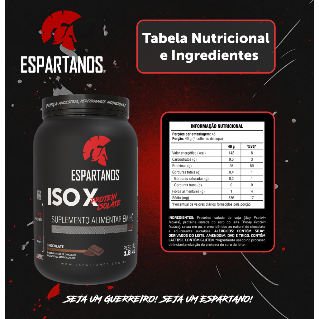 Whey Protein ISO X 100% Pure Isolate 1800g - Espartanos Alcance a grandeza física com o Whey Protein Isolado ISO X! Agora disponível diretamente da fábrica em deliciosos sabores de Morango, Baunilha e Chocolate. Com nosso pote de 1800g , você terá força de sobra para dominar qualquer desafio! Construção Muscular Poderosa: O ISO X é o combustível para o crescimento muscular impressionante. Com nossa proteína whey isolada de alta qualidade, você fornecerá ao seu corpo os nutrientes necessários para desenvolver músculos fortes e definidos. Prepare-se para se tornar uma verdadeira força da natureza! Recuperação Rápida e Eficiente: Após cada treino intenso, a recuperação é essencial para continuar evoluindo. Com o ISO X, sua recuperação será potencializada, permitindo que você se levante mais rápido e pronto para a próxima batalha. Esteja preparado para enfrentar qualquer desafio físico com vitalidade renovada. Sabores Irresistíveis: Desfrute do prazer de saborear nosso Whey Protein Isolado em três opções deliciosas: Morango, Baunilha e Chocolate. Cada dose será uma experiência sensorial incrível que fará você ansiar por mais. Transforme seu shake pós-treino em um momento de satisfação e prazer. Absorção Instantânea: O ISO X é formulado para ter uma absorção rápida e eficiente pelo seu corpo. Isso significa que os nutrientes vitais chegam aos seus músculos rapidamente, proporcionando a nutrição necessária para um crescimento máximo. Obtenha resultados impressionantes em menos tempo. Fonte Direta da Fábrica: Ao adquirir o ISO X diretamente de nossa fábrica, você garante um produto autêntico e de qualidade incomparável. Nossa dedicação em fornecer o melhor whey protein isolado é evidente em cada porção. Confie em uma fonte confiável e alcance a grandeza com os verdadeiros guerreiros! SUGESTÃO DE USO Porção: 40g (4 colheres de sopa) Rende 45 porções Desperte o verdadeiro guerreiro dentro de você! Adquira agora mesmo o Whey Protein Isolado ISO X em nosso pote de 1800g e conquiste a grandeza física que você merece! #WheyProtein #ConstruçãoMuscular #Recuperação #Espartanos ANVISA: Registro ISENTO conforme resolução RDC 27 de 06 de agosto de 2010 anexo I. *** IMAGENS MERAMENTE ILUSTRATIVAS ***