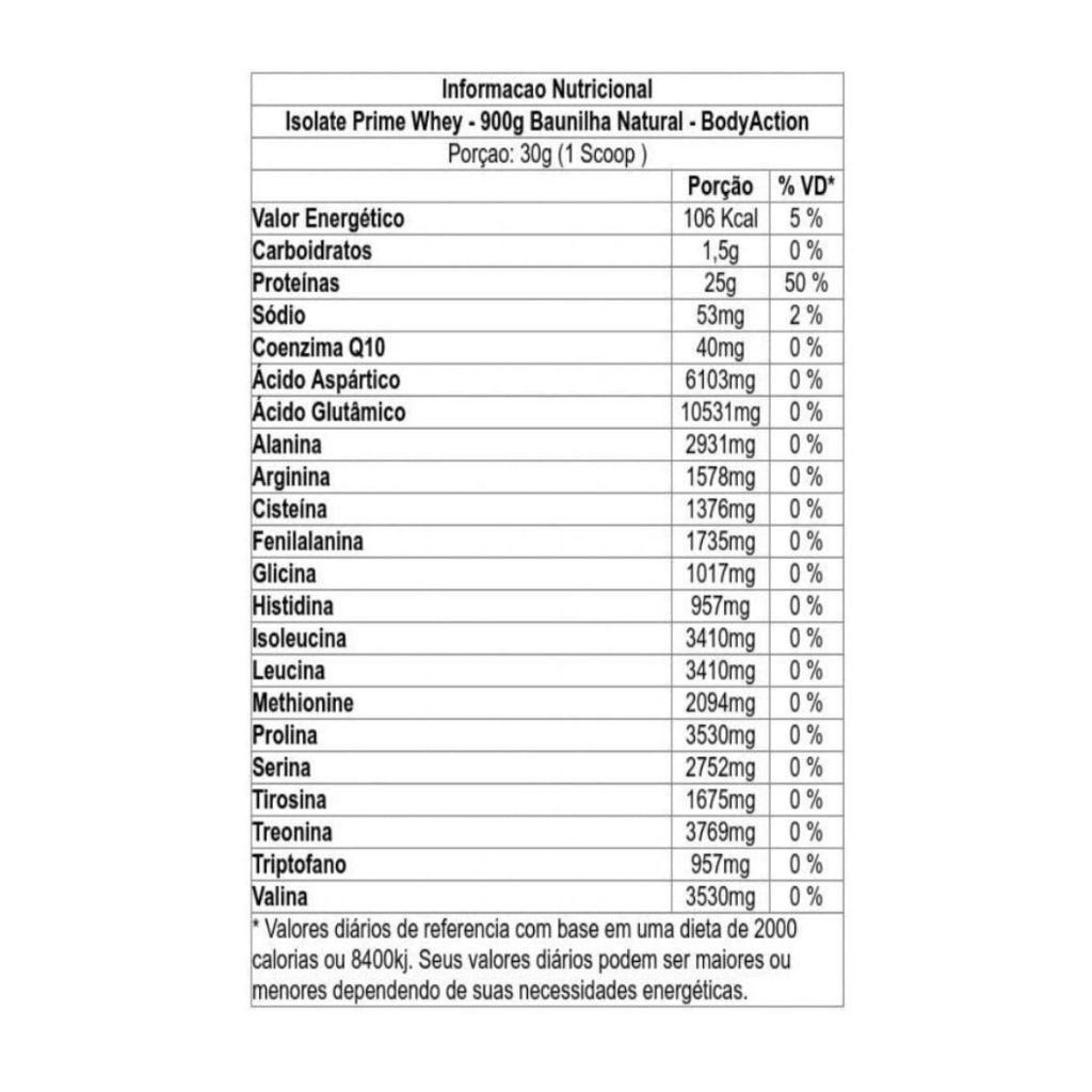 Isolate Prime Whey – Performance, Recuperação e Pureza O Isolate Prime Whey da Bodyaction é um suplemento premium, desenvolvido especialmente para atletas que buscam resultados avançados e suplementação de alto nível. Formulado com 100% Whey Isolado e Hidrolisado, oferece 25g de proteína por dose, além de ingredientes diferenciados, como Coenzima Q10 e 10,3g de BCAA, para melhorar a recuperação muscular e o desempenho nos treinos. Objetivos do Isolate Prime Whey: - Prevenir o catabolismo muscular - Auxiliar na recuperação pós-treino - Promover ganho de massa muscular magra - Melhorar a absorção de aminoácidos essenciais - Reforçar o sistema imunológico - Suplementar a dieta com proteínas de alto valor biológico Características principais: - 25g de proteína por porção - 40mg de Coenzima Q10 para suporte antioxidante - Apenas 1,5g de carboidratos por dose - Contém treonina, biotina e glicina para auxiliar na recuperação muscular Modo de preparo: Misture 30g (aproximadamente 1 scoop) com 150ml de água ou bebida de sua preferência. Varie a quantidade de líquido para ajustar o sabor e a consistência. Sugestão de uso: Consumir uma porção uma vez ao dia após o treino ou conforme orientação de um nutricionista ou médico. Produto indicado para maiores de 19 anos. Ingredientes: Proteína isolada do soro de leite, proteína hidrolisada do soro de leite, Coenzima Q10, goma xantana, dióxido de silício, glicosídeo steviol (Stevia rebaudiana). Aromas naturais variam conforme o sabor: baunilha, cacau ou morango. Não contém glúten nem lactose. Alérgicos: contém derivados do leite e pode conter traços de ovo e soja. Conservação: Armazenar em local fresco, seco e protegido da luz. Após aberto, consumir em até 25 dias e manter o pote bem fechado. Avisos importantes: Este produto não é um medicamento. Não exceda a recomendação diária indicada na embalagem. Mantenha fora do alcance de crianças. Recomendado para adultos a partir de 19 anos. Consulte sempre um profissional antes de iniciar qualquer programa de exercícios, dieta ou uso de suplementos.