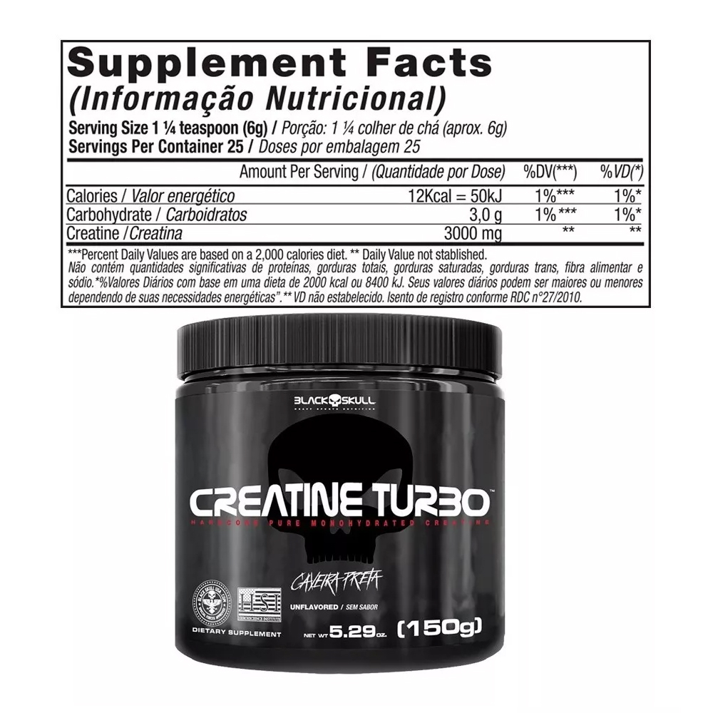 A creatina turbo enviada nesse anúncio é em refil de 150g, sabor laranja. COMPOSIÇÃO DO ANÚNCIO 1x BCAA 2400 - 30 TABLETES - BLACK SKULL / CAVEIRA PRETA 1x CREATINE TURBO REFIL - 150G - BLACK SKULL / CAVEIRA PRETA 1x WHEY PROTEIN TURBO REFIL - 907G - BLACK SKULL / CAVEIRA PRETA 1x COQUETELEIRA - ENVIADA CONFORME DISPONIBILIDADE EM ESTOQUE DESCRIÇÃO DO ANÚNCIO O Whey Turbo veio para turbinar seus músculos! Com 30g de proteína por porção, ele combina Whey Protein Concentrado com Maltodextrina, que por sua vez contribui na absorção da proteína. WHEY PROTEIN Um dos suplementos mais consumidos do mundo atualmente por diversas áreas no esporte como também na nutrição clínica, derivado do soro do leite, mais conhecido como Whey Protein, garante proteína de alto valor biológico com objetivos de manutenção muscular, auxiliar no anabolismo e recuperação das fibras musculares de praticantes de atividades físicas em geral até em pacientes que necessitam de uma dieta enteral. As proteínas obtidas a partir do soro do leite são classificados conforme o seu grau de processamento, como: proteínas concentradas, isoladas e hidrolisadas. SRO - um processo de refinação que remove os contaminantes usando pressão da água para forçar as moléculas através de uma membrana semipermeável. Durante esse processo, os contaminantes são filtrados e lavados, deixando a proteína mais pura. Benefícios: -Ganho de força e massa muscular; -Aminoácidos essenciais em quantidade e proporções fisiologicamente ideais; -Alta digestibilidade e biodisponibilidade excelente; -Alto índice de eficiência proteica. Ingredientes: Proteína concentrada do soro do leite, maltodextrina, aromatizante e edulcorante sucralose. CONTÉM LACTOSE. NÃO CONTÉM GLÚTEN. Sugestão de uso: Misture 12 colheres de sopa (120g) em 150 a 200 ml de água, uma vez ao dia. ----------------------------------------------------------------------------------------------------------------------------- A Creatine Turbo é um suplemento a base de Creatina Monohidratada e Maltodextrina, o que contribui para melhor absorção da fórmula, além do carboidrato agir no aumento de energia, visando apoiar seus resultados nas atividades físicas. A creatina é um composto de aminoácido criado pelos rins, fígado e pâncreas, por meio dos aminoácidos arginina e glicina, presentes nos alimentos com carnes e peixes, sendo que a cada 1kg de carne vermelha, encontra-se 5g de creatina. O uso desse suplemento sempre esteve em alta no mercado devido sua função de fortalecimento de energia temporária, aumento de força e promove a hipertrofia devido ao aumento de força e volume de treinamento. Benefícios: -O aumento do conteúdo energético proporciona uma rápida recuperação durante as pausas rápidas em treinos intensos. Ocorre também um aumento considerável de força, repercutindo nos ganhos finais de massa muscular. -Ressíntese das fontes energéticas (ATP); -Síntese proteica (músculos maiores e mais definidos); -Maior desempenho nas atividades de força e potência muscular; -Maior sobrecarga muscular; -Aumento da massa corporal magra e massa muscular. Ingredientes: Creatina monohidratada e maltodextrina. NÃO CONTÉM LACTOSE. NÃO CONTÉM GLÚTEN. Sugestão de uso: Misture 1 colher de chá (aprox. 6g) em 150 ml de água, uma vez ao dia. ----------------------------------------------------------------------------------------------------------------------------- BCAA 2400: Na proporção 2:1:1, exatamente o que você precisa para melhorar os seus resultados. São 2.400mg de aminoácidos essenciais, L-Leucina, L-Isoleucina e L-Valina, considerados os “blocos construtores” da musculatura. Ingredientes:L-Leucina, L-Isoleucina, L-Valina, Estabilizante Cellulose Microcristalina e Polivinilpirrolidona, Antiumectante Dioxido de Silício e Estearato de Magnésio. NÃO CONTÉM GLÚTEN. Sugestão de uso: Consumir 4 cápsulas uma vez ao dia. Conservar em local seco e fresco. Crianças, gestantes, idosos e portadores de qualquer enfermidade devem consultar o médico e/ou nutricionista.
