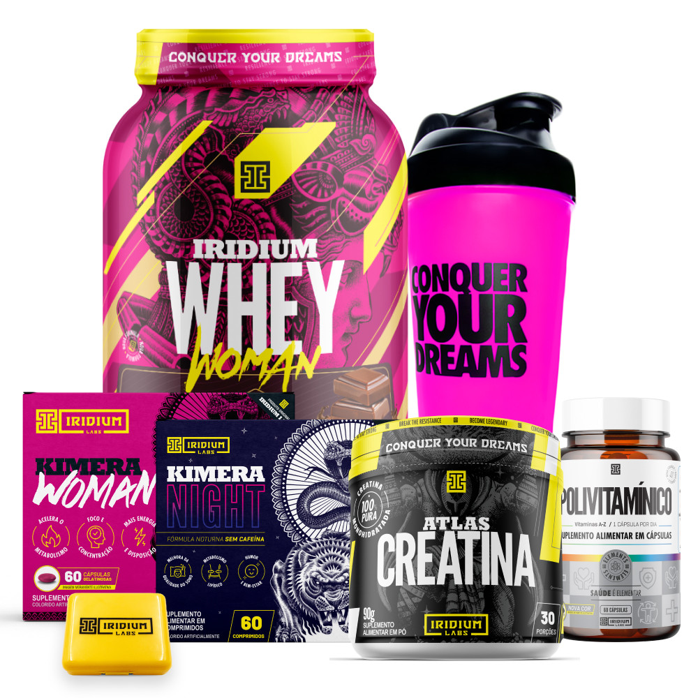Whey Protein Woman + Creatina 90g + Kimera Woman + Kimera Night + Polivitaminico 60comps + Coqueteleira + Porta Caps