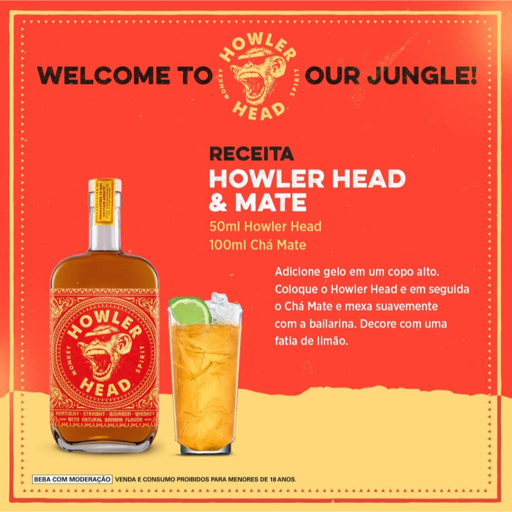 Whiskey Howler Head Banana Bourbon 750ml Howler Head é o whisky oficial do UFC, uma mistura de bourbon whiskey americano com o sabor natural de banana. É feito com um legítimo Kentucky Straight Bourbon Whiskey, ou seja, o whiskey possui no mínimo dois anos de envelhecimento em barris de carvalho americano nunca antes utilizados e tostados por dentro. No caso do Howler Head, a torra é feita até o nível #4, um dos mais intensos. Pode ser apreciado em ocasiões mais informais, como festas e baladas, até em clima de praia.