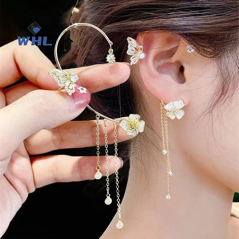 Whl Novo Estilo Moda Simples Super Flash Diamante Borboleta Diamante Flor de Borboleta Senhoras Brincos de Tassel Não Perfurados