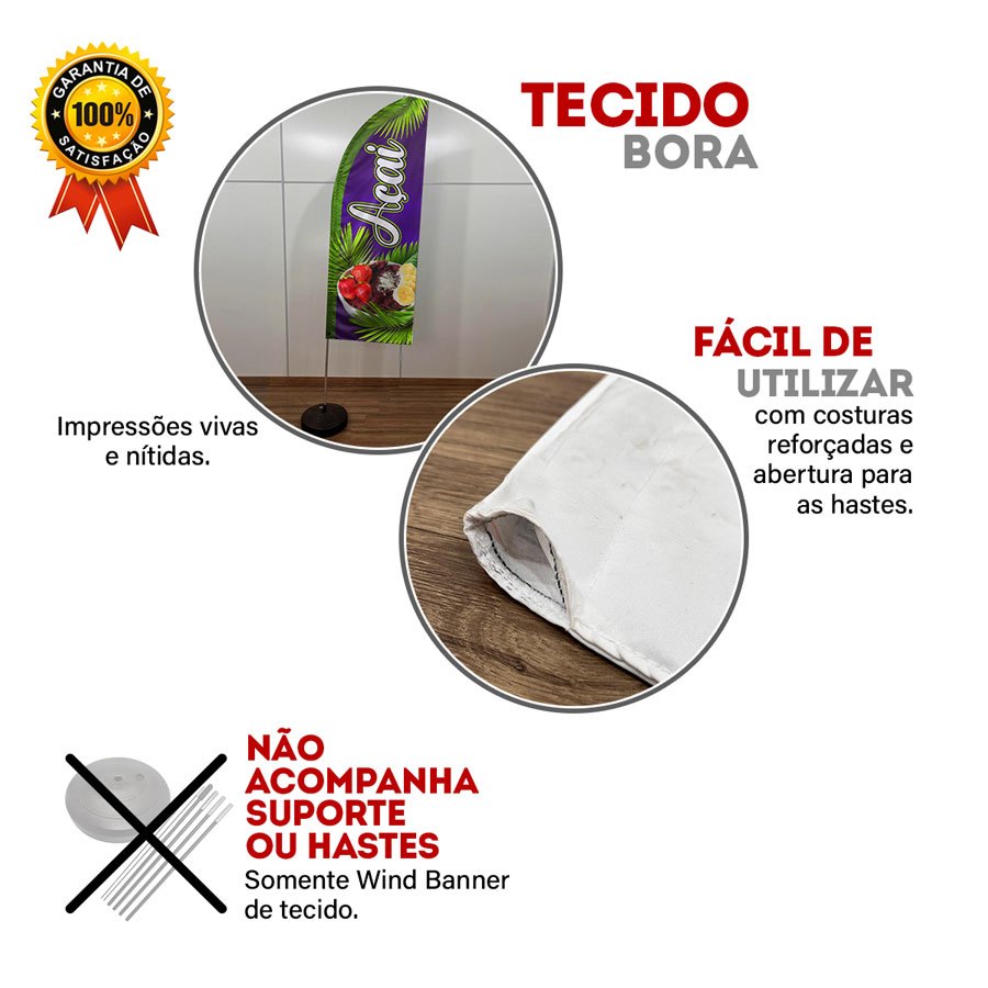 SE VOCÊ BUSCA AUMENTAR A VISIBILIDADE DA SUA MARCA, O WIND BANNER DA FELICITÁ SUBLIMAÇÕES É A SOLUÇÃO IDEAL! ***** NÃO ACOMPANHA SUPORTE (HASTE E BASE) ***** FICHA TÉCNICA: - Material: Tecido Bora; - Acabamento: Costura em Overlock nas Laterais; - Impressão: Os produtos são produzidos por meio da impressão sublimada com alta resolução, durabilidade e capacidade de reproduzir cores vivas e detalhes finos; - Qualidade: Não reflete luz; - Garantia: Contra defeito de fabricação. MEDIDA: - 0,75 de Largura X 2,00 de Altura. Temos outras opções de medidas e modelos disponíveis. Para saber mais, entre em contato com o nosso time de atendimento via Perguntas, ou mensagem na sua última compra. NFORMAÇÕES ADICIONAIS SOBRE O PRODUTO: - As cores dos banners podem variar de tonalidade em 15% devido a resolução o monitor ou tela do celular, mas nada que interfira na qualidade do produto; - Possui efeitos com tecnologia em 3D; - Os Banners SÃO do tipo veste fácil, permitindo assim a fácil aplicação na haste e suporte. - Os produtos NÃO acompanham nenhum tipo de estrutura. INSTRUÇÕES DE LAVAGEM: - Utilize sabão neutro; - Não torça o tecido; - Não coloque em máquinas de lavar; - Para secar, vire do lado avesso em baixa temperatura; - Evite exposição direta ao sol. PRAZOS E ENVIO: - Nossos produtos são enviados para todo o Brasil com Nota Fiscal e embalagens personalizadas com a nossa marca. Cuidado com fraudes! - O prazo de entrega é estipulado pela plataforma, faça uma simulação de compra e verifique o prazo de entrega. ATENÇÃO CLIENTES: - Não fazemos alterações ou troca das imagens do anúncio; - Realizamos personalização de temas para clientes recorrentes. Caso tenha interesse em solicitar um desenvolvimento, entre em contato conosco pelas perguntas, ou por mensagem na última compra que realizou; - Caso não encontre o tema de seu interesse, mande nas perguntas o modelo que gostaria, ou nos envie uma mensagem na sua última compra conosco; - Caso tenha divergência com seu produto, antes de efetuar devoluções ou cancelamentos, entre em contato com a gente via mensagem em sua última compra. AINDA FICOU COM ALGUMA DÚVIDA? Deixe sua pergunta ou entre em contato com a nossa equipe diretamente pelos canais de comunicação. Iremos te atender o mais rápido possível.