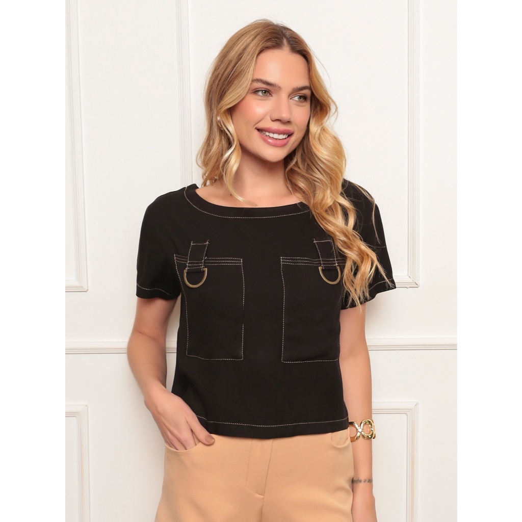 Blusa de viscose sarja. Todo pespontado. Bolso com fivela meia lua. Confortável, bem fresquinho para usar no dia a dia. Vem um pouco abaixo da cintura a ponto de não precisar por para dentro da calça ou shorts. P: busto 100/ comprim 49 M: busto 104/ comprim 50 G: busto 108/ comprim 51