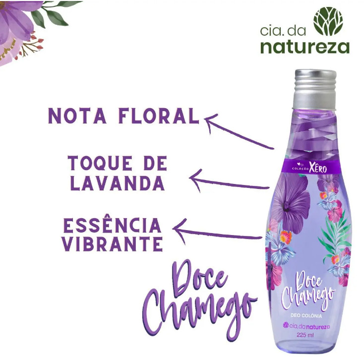 Descrição: Cia Da Natureza Deo Colônia Doce Chamego 225ml Inspirada na força, na alegria e no jeito descontraído da mulher brasileira. Fragrância leve e perfeitas para o dia a dia e um jeito arretado de refrescar o seu dia! BENEFICIOS Maior sensação refrescante. Colônia Ação desodorante. Sensação de banho prolongado. MODO DE USO Borrife diretamente a colônia no corpo todo sempre que quiser uma sensação de frescor e suavidade.