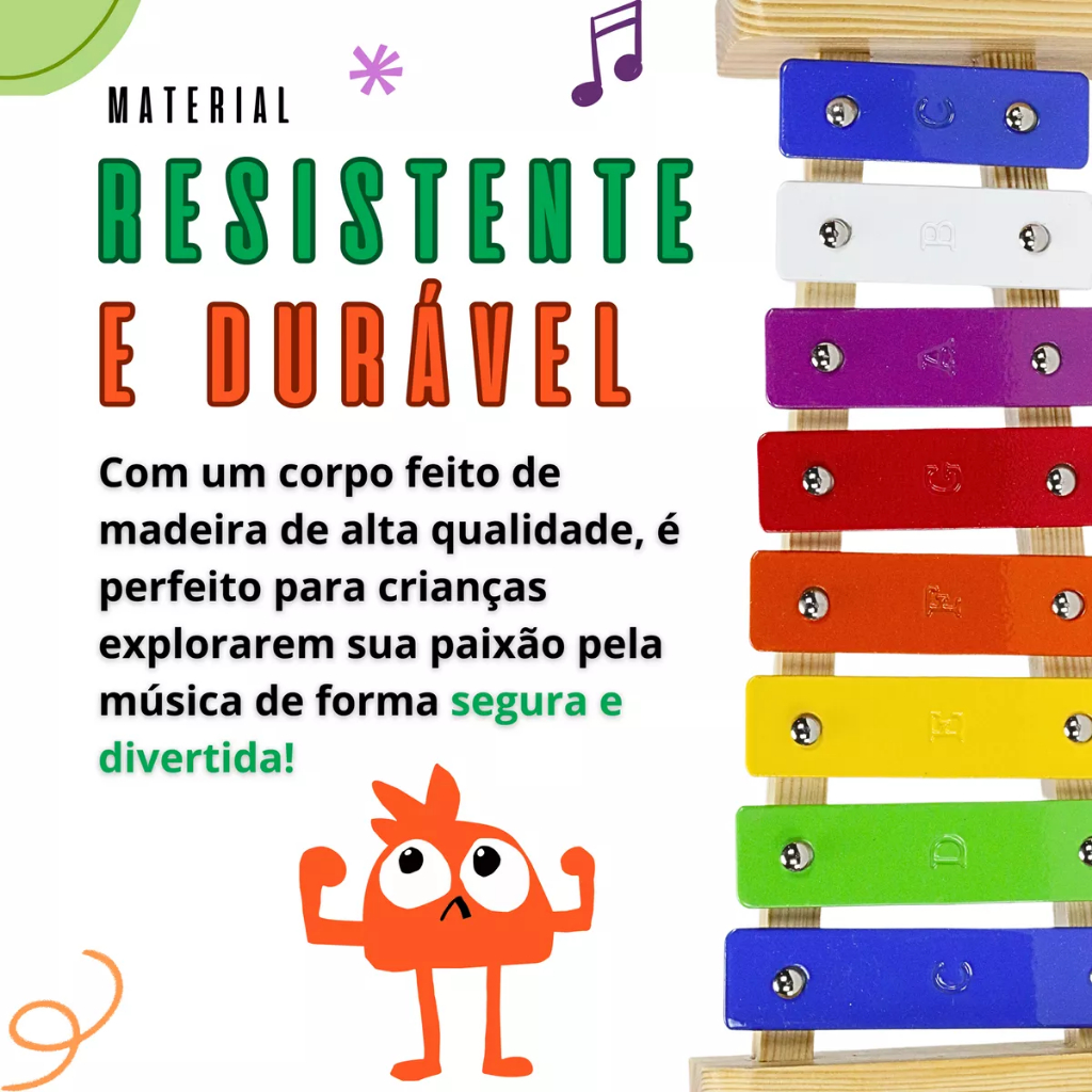 Um instrumento musical lúdico e educativo que conquista crianças e adultos — ideal para aulas de musicalização, apresentações escolares ou diversão tranquila em casa. Especificações técnicas: ° Notas: Dó, Ré, Mi, Fá, Sol, Lá, Si, Dó ° Material resistente: Teclas em alumínio e estrutura com bordas lisas e seguras ° Som claro e timbre agradável ° Instrumento educacional, ideal para crianças, músicos iniciantes e uso em salas de aula ° Compacto e fácil de transportar, perfeito para aulas e prática em qualquer lugar Itens incluso: ° 1 Xilofone Konig de 8 notas PROFISSIONAL ° 2 Baquetas Medidas: ° Peso: 311g ° Altura: 5cm ° Largura: 11cm ° Comprimento: 26cm Benefícios: ° Teclas coloridas em metal que facilitam a identificação das notas ° Base em madeira leve, resistente e com acabamento seguro ° Acompanha 2 baquetas para prática imediata ° Estimula coordenação motora, percepção auditiva e criatividade ° Para todas as idades Garantia de Qualidade: ° 90 dias de garantia contra defeitos de fabricação, conforme o Código de Defesa do Consumidor ° Emissão Nota Fiscal Garantia do vendedor: 3 meses