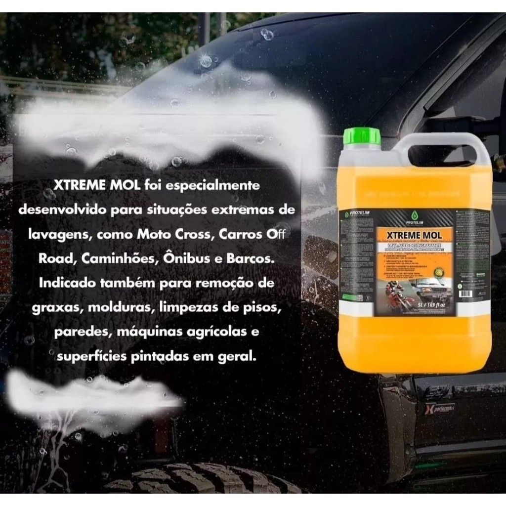 XTREME MOL DETERGENTE DESENGRAXANTE AUTOMOTIVO XTREME MOL foi especialmente desenvolvido para situações extremas de lavagens como motocross, carros off road caminhões ônibus e barcos. Indicado também para remoção de graxas, molduras, limpezas de pisos, paredes, máquinas agrícolas e superfícies pintadas em geral. Sua fórmula balanceada contém tensoativos biodegradáveis e sequestrantes que facilitam a remoção de sujidades mais difíceis Este detergente desengraxante automotivo possui altíssima diluição alto poder de espuma, não mancha plásticos borrachas e alumíniosEMBALAGENS 500ml 1 5L 5L e 20LBENEFÍCIOSLivre de corrosãoNão danifica a pinturaContém tensoativos biodegradáveisQuero ComprarModo de UsarDilua o produto de acordo com as instruções abaixoLimpeza pesada 1 parte do produto para até 10 partes de água.Limpeza média 1 parte do produto para até 50 partes de água.Limpeza leve 1 parte do produto para até 120 partes de água.Snow foam 100 ml do produto para 900 ml de águaAplique o detergente desengraxante automotivo XTreme Mol sobre a superfície a ser lavada manualmente ou por meio de máquina.Esfregue com pano ou esponjaEnxágue com água em abundânciaIMPORTANTEAs diluições citadas são apenas orientativas podendo ser alteradas.Utilize Equipamento de Proteção Individual EPIsIndicaçãoIdeal para situações extremas de lavagens, como motocross, carros off road caminhões ônibus e barcos. Indicado também para remoção de graxas, molduras, limpezas de pisos paredes, máquinas agrícolas e superfícies pintadas em geral