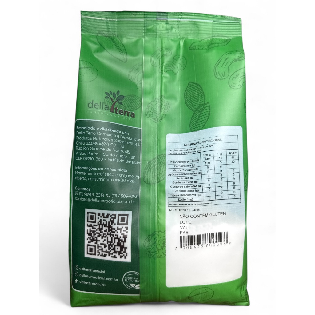 IMAGEM REAL DO PRODUTO. EMBALAGEM NOVA. A Della Terra é uma empresa especializada em produtos naturais de qualidade. Produzimos alimentos naturais com foco em segurança, frescor e eficiência. Nossa fábrica tem maquinário de embalagem automatizado, garantindo higiene total e zero contato manual. Oferecemos envio rápido, atendimento humano e suporte completo — porque acreditamos que qualidade vai além do produto. Nossa missão é promover o bem - estar e a saúde, incentivando um estilo de vida equilibrado e sustentável. Produtos naturais com padrão industrial e alma artesanal. DESCRIÇÃO DO PRODUTO: CONTÉM 500g de xilitol por embalagem. O xylitol Della Terra, é produzido a partir de açucares encontrados em alimentos como frutas, e fermentado por leveduras. O xylitol é o aliado perfeito para sua dieta, auxiliando na perda de peso, ou para quem deseja levar um estilo de vida mais saudável. Podemos destacar a diminuição significativa do consumo de calorias. Não altera os níveis de açúcar no sangue, evitando o surgimento de diabetes e outras doenças. Muito usado para substituir o açúcar comum, podendo ser adicionada em sucos, ou também em receitas, como sobremesas, já que pode ser aquecido. As maiores diferenças entre eritritol e xylitol: xylitol tem baixo índice glicêmico, o eritritol tem índice glicêmico inferior a 1, o que é considerado zero. O xylitol adoça como o açúcar, já ao eritritol tem poder adoçante de 70% do açúcar. A melhor maneira de armazenamento é manter em potes fechados, de preferência herméticos. INGREDIENTES: XILITOL. NÃO CONTÉM GLÚTEN.