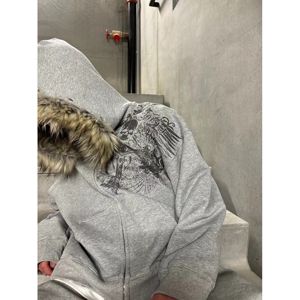 Y2K American Skeleton Pattern Print Hoodies Mullets Hip Hop Punk Moda Gola De Pele Moletons Com Zíper