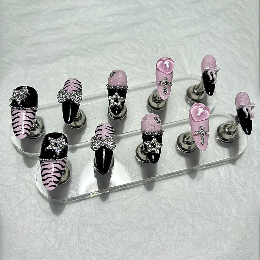 Y2K Baddie Gyaru Preto Rosa Ponta Longa Prensa Francesa Em Unhas Doce Legal Escuro Jirai Nail Art 3D Arco Estrela Cruz A
