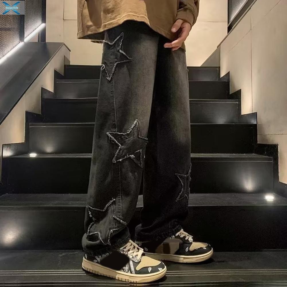Y2K Vintage Coreano Roupa De Rua Masculina Estrela Estética Jeans De Perna Larga Preto