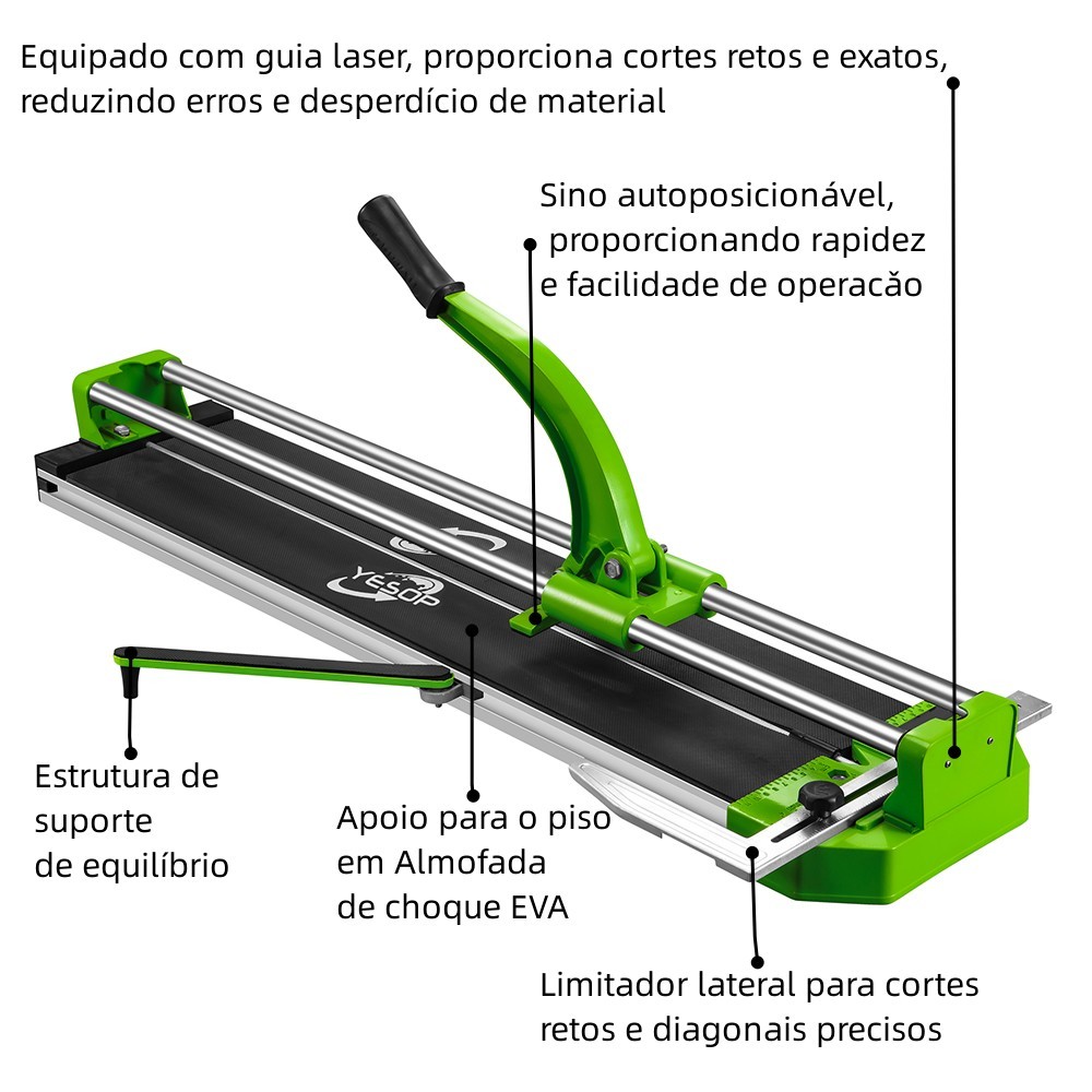 YESOP Cortador/Riscadeira De Piso Manual Capacidade Até 1250 mm E Guia Laser E Limitador O cortador profissional é ideal para cortar pisos cerâmicos e porcelanatos com até 12mm de espessura. -Corte Profissional e Preciso – Equipado com guia laser, proporciona cortes retos e exatos, reduzindo erros e desperdício de material. - Possui limitador lateral para cortes retos e diagonais precisos -Base Antiderrapante, Proporciona segurança e firmeza ao realizar os cortes, evitando deslizamentos indesejados. -Design ergonômico e alavanca de corte eficiente para um trabalho rápido e sem esforço excessivo. - Apoio para o piso em Almofada de choque EVA - Suporte das guias em alumínio injetado - Barra de encosto em alumínio injetado proporcionando alta resistência e durabilidade - Sistema para separação de pisos na base do cortador proporcionando rapidez e facilidade de operação Aplicação: Indicada para o corte de pisos e revestimentos; Pode ser utilizada com cerâmica e porcelanato; Ideal para azulejistas, pedreiros e profissionais que exigem qualidade e precisão em cada projeto! Espessura máxima de corte de 12MM. Corta cerâmica com comprimento máximo de 1.25 m. Dimensões CxLxA(CM): 141x20x17 Tamanho da embalagem: 150*30*22CM Peso: 13.15Kg INSTRUÇÕES DE USO Preparação – Coloque na base do cortador a peça que será cortada, utilizando como ponto de apoio a barra de encosto graduada. Certifique-se de que o rodel está corretamente posicionado e fixado no carro-guia; Operação – Segurando a alavanca, apoie a vídea com uma leve pressão sobre a superfície do piso na extremidade oposta onde a peça está apoiada. Desta forma, deslize a vídea do rodel sobre a superfície do piso até o ponto de apoio, em um movimento contínuo e com leve pressão. Certifique-se após, se o risco na superfície ocorreu de forma contínua de uma extremidade a outra da peça. Eleve a alavanca para que o sino separador seja automaticamente acionado. Abaixe a alavanca, pressionando o sino separador sobre a superfície da peça, elevando a pressão até que o corte aconteça.