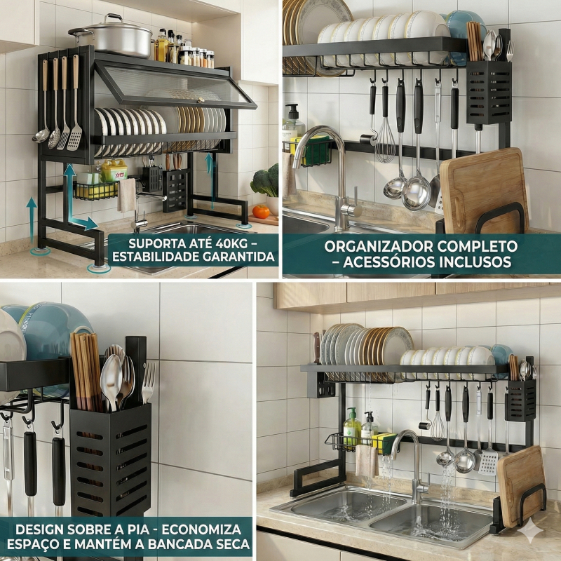 YESOP Organizador de Cozinha Sobre Pia Premium - Aço Carbono Anti-ferrugem Descrição do Produto Cansado de bancadas bagunçadas e falta de espaço na sua cozinha? O Organizador de Louças YESOP é a solução definitiva para quem busca sofisticação, praticidade e otimização real de espaço. Com design inteligente "sobre a pia", ele permite que a água escorra diretamente para a cuba, mantendo sua cozinha sempre seca e organizada. Por que escolher o Organizador YESOP? Material de Alta Qualidade: Fabricado em aço carbono com pintura eletrostática de alta resistência. É totalmente anti-ferrugem e resistente à corrosão, ideal para o ambiente úmido da cozinha. Estrutura Ultra Estável: Design autossustentável com ventosas antiderrapantes na base, garantindo que o rack não balance, mesmo com carga total de pratos e panelas. Multifuncionalidade 100%: Inclui suportes específicos para tábuas de cortar, facas, talheres, esponjas e ganchos para utensílios. Tudo ao alcance da sua mão. Design Moderno e Elegante: O acabamento em Preto Fosco (Black Matte) confere um toque industrial e luxuoso que combina com qualquer decoração moderna. Especificações Técnicas: Marca: YESOP Material: Aço Carbono Premium (Alta durabilidade) Cor: Preto (Pintura Epóxi) Capacidade de Carga: Suporta até 40kg com total estabilidade. Fácil Montagem: Acompanha kit completo de instalação e manual intuitivo. Conteúdo da Embalagem: 1x Estrutura de Escorredor YESOP 1x Suporte para Tábuas 1x Suporte para Facas/Talheres 1x Cesto para Detergente/Esponja Ganchos Utilitários Extra