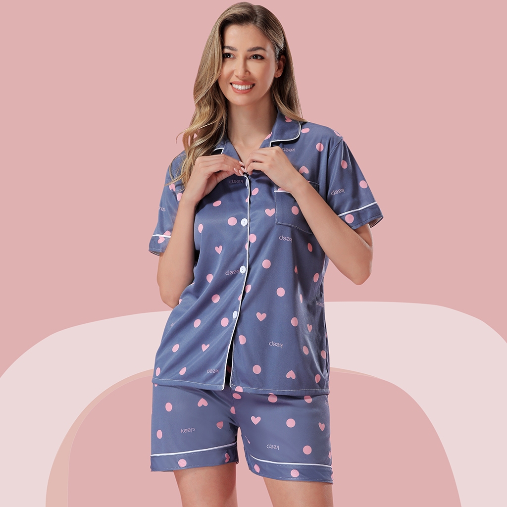 Z&D Lingerie Conjunto Pijama Feminino Curto Azul com Estampa de Corações e Bolinhas SY11