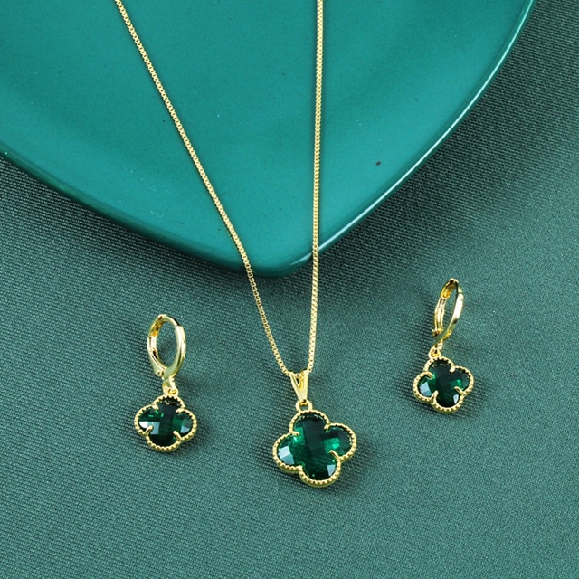 ZANNE COLAR + BRINCO TREVO VIRGINIA VERDE FOLHEADO A OURO 18K