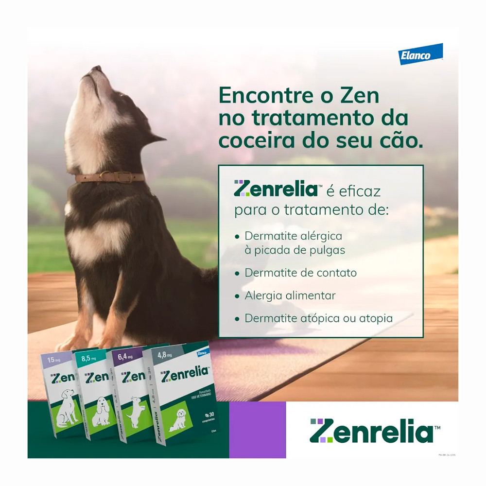 - Indicado para cães adultos; - Tratamento da coceira associada à dermatite alérgica e atópica em cães; - Com rápida ação para alívio da coceira; - Efeito de longa duração; - Seguro e eficaz no tratamento de dermatites alérgicas; - Dose única diária. Zenrelia é o novo inibidor de JAK oral que representa a evolução no tratamento da coceira associada à dermatite alérgica e atópica em cães, proporcionando alívio rápido e eficaz com apenas uma dose diária - desde o início. Um tratamento de coceira em cães adultos recomendado contra pruridos, lesões, inflamações e coceiras de dermatites e alergias alimentares. De ação rápida e eficaz, você precisa de apenas uma dose diária para ver os resultados da terapia. Modo de usar Zenrelia é um comprimido de ilunocitinib que deve ser administrado por via oral, uma vez ao dia, na dose de 0,6 a 0,8 mg de ilunocitinib/kg de peso corporal. Zenrelia pode ser administrado com ou sem alimentos. Para cães com mais de 75 kg de peso corporal, administrar uma combinação adequada de apresentações disponíveis de Zenrelia. Composição Cada 100mg de Zenrelia 4,8mg contém: • Ilunocitinib: 2,4mg; • Excipiente q.s.p.: 100mg.