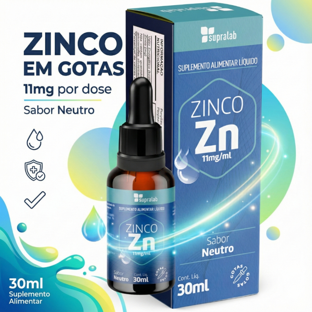 Zinco em gotas em formato líquido, fácil de consumir e com dosagem precisa. Cada dose fornece 11mg de zinco, em uma apresentação prática de 30ml e sabor neutro, ideal para quem prefere suplementação líquida em vez de cápsulas. Zinco em gotas da Supra Lab é um suplemento prático de zinco, um mineral fundamental e que exerce um papel essencial em várias funções corporais, dentre elas, atua no funcionamento do sistema imune, no processo de visão, na manutenção do cabelo, pele, unhas e ossos, além de atuar na síntese de proteínas e no metabolismo de carboidratos e gorduras. Sua forma líquida facilita a rápida absorção, além da praticidade e alta concentração em gotas. Cada ml (20gotas) possui 11mg de zinco livre, que garante 100% da ingestão diária recomendada para adultos. É indicado para a suplementação de jovens, adultos, idosos, gestantes e lactantes. INGREDIENTES Água potável e bisglicinato de zinco, agente de massa sorbitol, acidulante ácido cítrico, conservadores sorbato de potássio e benzoato de sódio. NÃO CONTÉM GLÚTEN. RECOMENDAÇÃO DE USO (4 à 8 anos): Ingerir 10 gotas (0,5ml) 1 (uma) vez ao dia. (maiores de 8 anos), jovens, adultos e idosos: Ingerir 20 gotas (1ml) 1 (uma) vez ao dia.