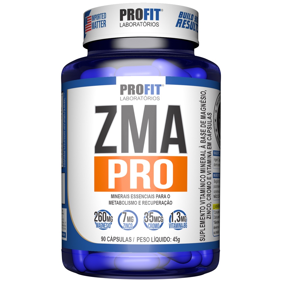 COMPOSIÇÃO DO ANÚNCIO : 1x - ZMA PRO 90 CÁPSULAS PROFIT LABORATÓRIOS DESCRIÇÃO DO PRODUTO O ZMA PRO é um suplemento que contém em sua fórmula uma combinação de zinco, magnésio, cromo e vitamina B6. Estudos indicam que esses minerais ajudam a manter níveis adequados de testosterona, e podem ajudar a melhorar o desempenho e o desenvolvimento. SUGESTÃO DE USO: Ingerir 2 cápsulas preferencialmente de 30 à 60 minutos antes de dormir com a bebida de sua escolha. INGREDIENTES: Bisglicinato de magnésio, maltodextrina, bisglicinato de zinco, picolinato de cromo, piridoxina (vitamina B6) e cápsula (gelatina, corantes azul brilhante, azorrubina e dióxido de titânio). NÃO CONTÉM GLÚTEN.