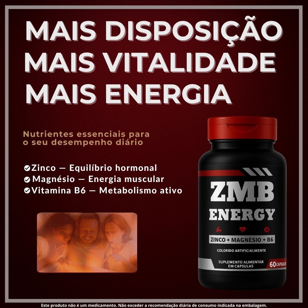 Este anúncio contém 1 ZMB Energy com 60 cápsulas (30 porções). O ZMB Energy é um suplemento alimentar especialmente desenvolvido para o público masculino que busca mais equilíbrio, vitalidade e disposição no dia a dia. Sua fórmula concentrada combina zinco, magnésio e vitamina B6, nutrientes essenciais que contribuem para o metabolismo energético, auxiliam em funções musculares e participam de processos importantes do organismo. Sugestão de uso: Consumir 2 cápsulas ao dia, preferencialmente à noite, com líquido, ou conforme orientação profissional. Diferenciais do ZMB Energy: • Fórmula Concentrada: combinação de minerais e vitamina B6 em doses equilibradas. • Vitalidade e Energia: nutrientes que auxiliam no metabolismo energético e na função muscular. • Confiança e Qualidade: produzido seguindo rigorosos padrões de qualidade e dentro das normas da Anvisa. Composição: • Zinco - 29mg • Magnésio - 200mg • Vitamina B6 - 40mg Avisos Importantes: • Este produto não é um medicamento. • Não exceder a recomendação diária de consumo indicada na embalagem. • Produto indicado para maiores de 19 anos. • Não consumir se o lacre estiver violado. • Manter fora do alcance de crianças. • Não recomendado para gestantes, lactantes e crianças. Aproveite agora e garanta já o seu ZMB Energy! Estoque limitado. ENVIO RÁPIDO / EMBALAGEM DISCRETA / FRETE GRATÍS