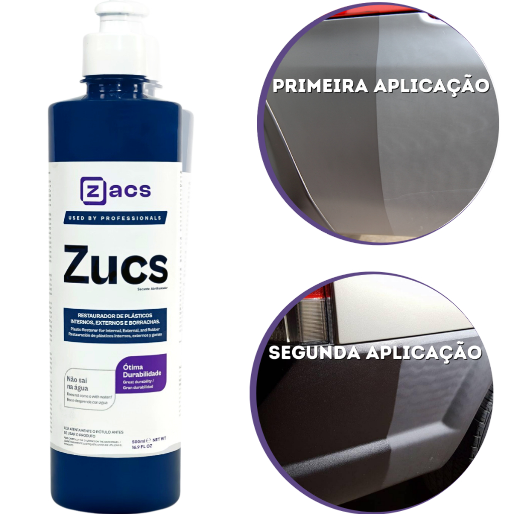 KIT CONTÉM: ZUCS 500ML APLICADOR DE ESPUMA PEQUENO ZACS PANO 40X40CM PAR DE LUVAS NITRILICAS -------------------------------------------------------------------------------- ZUCS 500ML ZACS DESCRIÇÃO: Zucs é um restaurador de plásticos 3 em 1 desenvolvido para plásticos internos, externos e borrachas em geral. O produto tem em sua composição de SiO2 e polímeros de última geração, que renova e protege plásticos e borrachas de veículos em geral. Poderá durar até 8 meses nos plásticos internos e 3 meses nos plásticos externos. MODO DE USO: 1. Certifique-se que a superfície esteja limpa e seca. 2. Com o auxílio de um aplicador de espuma ou de microfibra, aplique uniformemente o produto com movimentos circulares até perceber a completa restauração. 3. Observe o acabamento e se necessário, repita a operação. OBSERVAÇÃO: Você poderá regular o nível de brilho da aplicação. A aplicação em pequena quantidade e aplicador de microfibra dará menos brilho e ficará com aspecto mais parecido com uma peça original. Para quem busca acabamento mais brilhante, a aplicação deverá ser feita com aplicador de espuma e em maior quantidade.