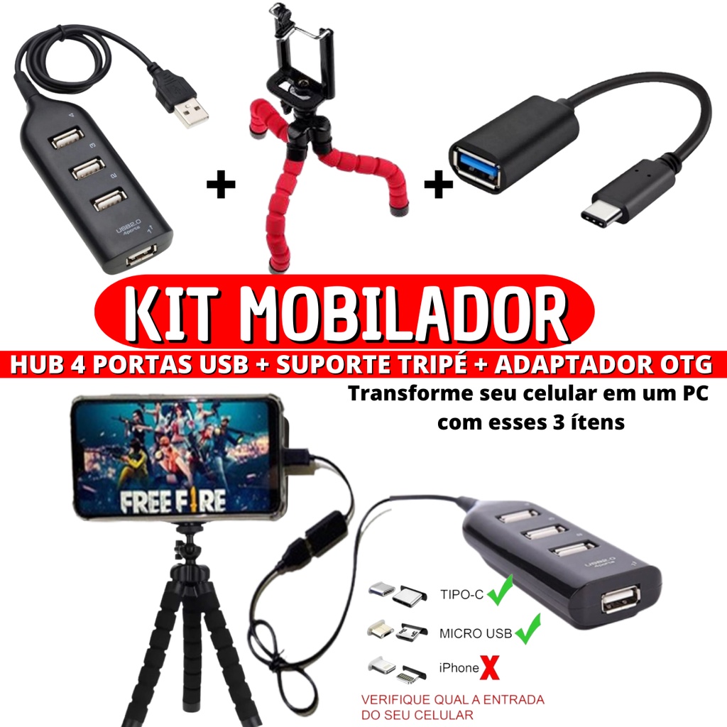 Kit Mobilador Hub 4 Portas USB + Cabo Adaptador OTG Tipo-c / Micro Usb V8 + Mini Tripe Suporte De Celular em Oferta na Shopee Shopee